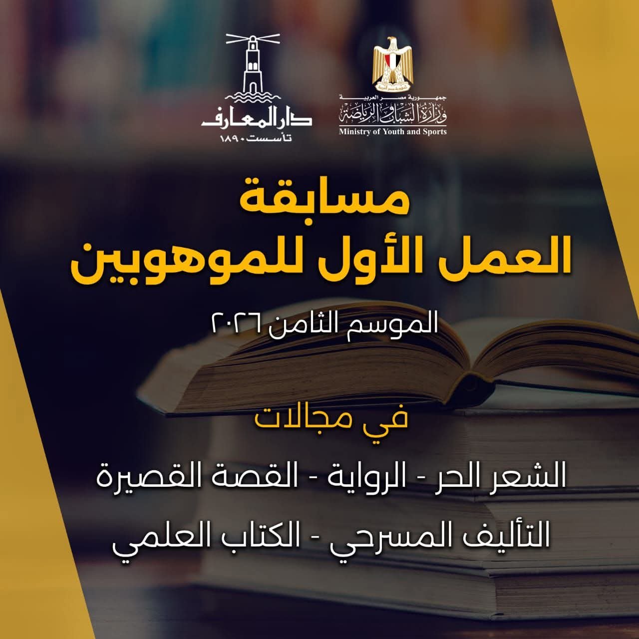 في خطوة تؤكد على استمرار دعم الدولة للطاقات الإبداعية الشابة، وتأكيدا على أن الإبداع ركيزة أساسية في بناء مستقبل الوطن، أعلنت وزارة الشباب والرياضة، من خلال الإدارة المركزية لتنمية الشباب (الإدارة العامة للبرامج الثقافية والفنية)، عن فتح باب التقدم للمسابقة الوطنية المرموقة “العمل الأول للموهوبين في المجالات الأدبية والثقافية”، وذلك في دورتها الثامنة، و بشراكة استراتيجية مع مؤسسة دار المعارف للطبع والنشر، صاحبة التاريخ العريق في دعم الفكر والأدب.